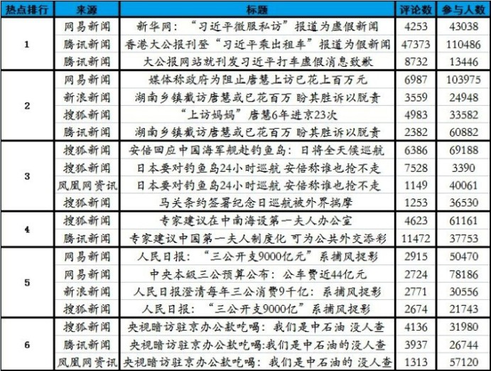综合今日舆情数据,今日舆情热度最高的事件是“新华网称习近平乘出租车报道为假新闻”,热度最高的单条网络新闻是腾讯新闻:“香港大公报刊登“习近平乘出租车”报道为假新闻” 截至今日上午12时,“湖南乡镇截访唐慧已花上百万元”相关话题位居今日舆情热点排行第二位,已有至少超过3.8万条网友评论和超过46万网友参与讨论。