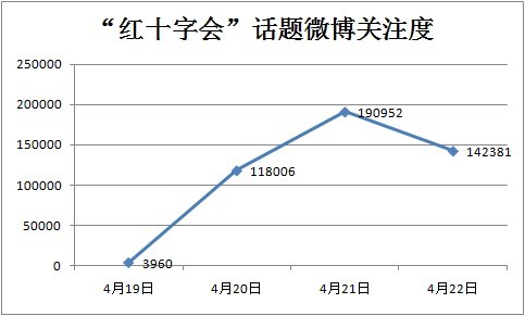 据人民网舆情监测室观察,4月20日以来,伴随着四川雅安地震事件,“红十字会”相关话题舆情热度持续升温,在4月20日起就开始在各类媒体和网络上形成一轮热度较高的舆情热点,20日当天的相关网络新闻超过2600篇,21日这一数字超过了8500篇。20日当天的相关微博超过11.8万条,21日超过19万条。