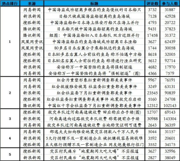 综合今日舆情数据,今日舆情热度最高的事件是“日本船只被中国海监船驱离钓鱼岛海域”,热度最高的单条网络新闻新浪新闻:“河南高速向过路救灾车队收费 称需提前办手续” 截至今日上午11时,“红会社监委拟重新调查郭美美事件”相关话题位居今日舆情热点排行第二位,已有至少35万网友参与讨论和超过5.4万条网友评论。