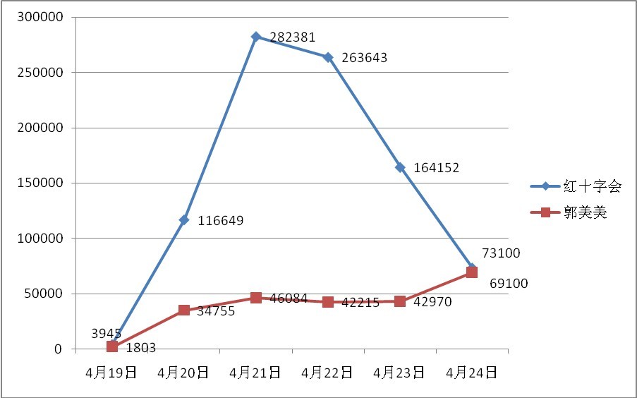 4月20日,四川雅安地震发生后,“郭美美事件”相关话题舆情热度迅速升温,20日当天的相关网络帖文超过140篇,相关微博则由之前的1000余条暴增到超过3.4万条。21日后相关微博数量均超过4万条。相关网络新闻和论坛帖文数量也在迅猛增长,22日,相关网络新闻超过800篇,23日这一数字超过900篇。