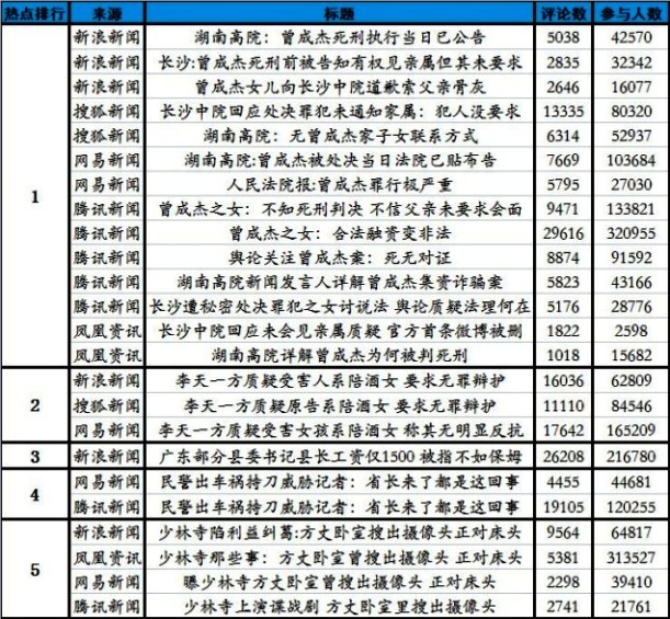 综合今日舆情数据,今日舆情热度最高的话题是“湖南高院、长沙中院回应曾成杰案”,热度最高的单条网络新闻是腾讯新闻“曾成杰之女:合法融资变非法”。截至今日11时,“湖南高院、长沙中院回应曾成杰案”话题位居今日舆情热点排行第一位,已有至少99万网友参与讨论和超过10.5万条网友评论。