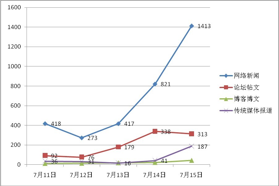 截止到今日(7月15日)15时,此话题相关舆情热度仍然在继续升温,今日的相关网络新闻已超过1400篇,相关微博更是超过26万条。相关论坛帖文超过300篇。其后势发展有待于进一步观察。