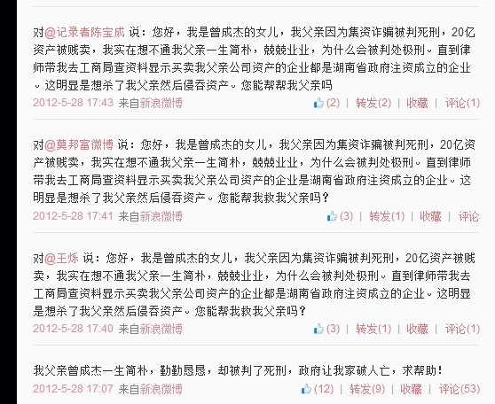 至少从2012年5月28日起,湖南湘西三馆集团总裁曾成杰之女曾珊就开始在自己的个人认证微博上持续为入狱的父亲喊冤,呼吁舆论关注“湖南曾成杰案”。该事件被一些网友称之为“曾珊微博救父”事件。随后引发众多媒体和网民们关注。