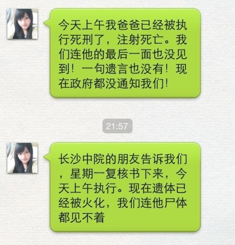7月12日晚10时04分,曾成杰的女儿在微博发布消息:“上午我爸爸已经被执行死刑了,注射死亡。我们连他的最后一面也没见到!一句遗言也没有!现在政府都没通知我们!”10时42分,她再次发微博:“一大早赶到法院,看到了执行死刑的布告。爸爸真的被杀了,我和哥哥脑子一片空白,为什么不通知我们,哪怕让我们看一眼遗体也成,为什么?法院保安说,可能周一才会通知我们领骨灰”。微博在网上迅速引发热议,质疑法院不通知家属的行为是否合情合法。