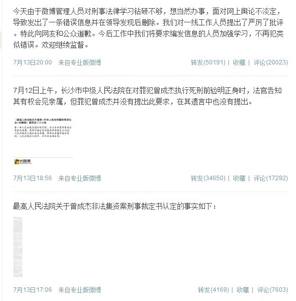 7月12日,长沙市中级人民法院对湘西非法集资案主犯曾成杰执行死刑,其女儿在微博上称,执行死刑当天没有接到通知,没有见到父亲最后一面。对此,长沙中院先后发3条微博回应,称罪犯曾成杰在死前并未提出会见亲属的要求。