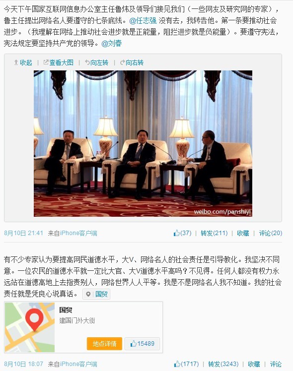 当天14时起,SOHO中国董事长潘石屹在自己的微博上陆续发布了赴央视参加“网络名人社会责任论坛”的一些消息,而随后一条据称为SOHO中国董事长潘石屹发出的关于“国家互联网信息办公室主任鲁炜及领导们接见网络名人时提出网络名人要遵守七条底线”的消息在网络上逐步扩散开来。而且潘石屹还在该微博中谈及自己对近来网络上最流行的“正能量”说法的理解“我理解在网络上推动社会进步就是正能量,阻拦进步就是负能量”。