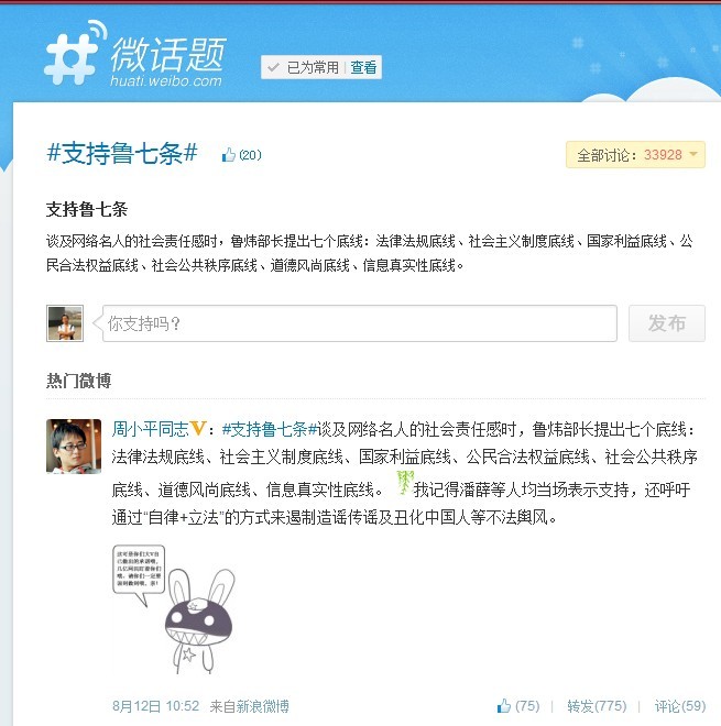 在新浪微博上,在潘石屹、刘春、薛蛮子、周小平等一批知名大V的大力推动下,在网络上迅速掀起了一轮#支持鲁七条# 运动。截至到8月15日18时,#支持鲁七条#话题相关微博已经超过33000条。