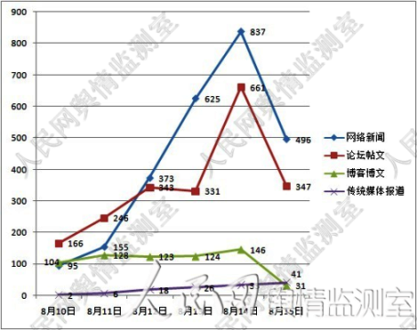 与此同时,我们看到在以网络新闻、论坛帖文为代表的网络媒体上,此话题舆情热度自11日以来一路走高,其单日相关网络新闻在14日达到一个相对峰值为超过800篇,相关论坛帖文超过660篇。这一舆情发展走向与微博舆情发展略有不同的是,微博上在8月12日形成一次舆情热点之后的相关舆情热度已经出现逐步回落态势。