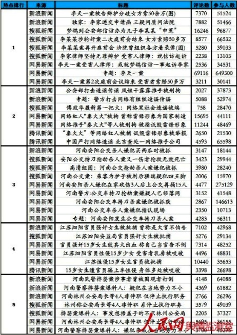 综合今日舆情数据,今日舆情热度最高的事件是“李某某涉轮奸案二次庭前会结束”,热度最高的单条网络新闻是网易新闻:“网络红人"秦火火"被拘 曾称雷锋形象为国家制造”。截至今日13时,“北京查处网络推手公司刑拘多人”相关话题位居今日舆情热点排行第二位,已有至少30万网友参与讨论和超过4.2万条评论。