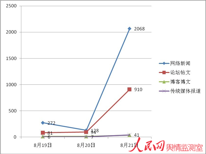 据人民网舆情监测室观察,今日(8月21日),以人民日报为代表的多家主流媒体报道了“北京警方查处网络推手公司”的消息。而“公安机关集中专项打击网络谣言”随后引来众多政务机构、媒体和网络上各方舆论的强烈关注和热烈讨论。“网络推手”相关话题舆情热度呈现迅速爆发性增长。此话题也成为今日持续增长的一大舆情热点。截止到今日14时,此话题单日相关网络新闻已超过2000篇,相关论坛帖文超过900篇,相关微博超过8万条。而此话题也与前些天国信办部署“打击网络谣言”话题相关舆情热度互相叠加,共同推动了相关舆情热度的大幅增长。