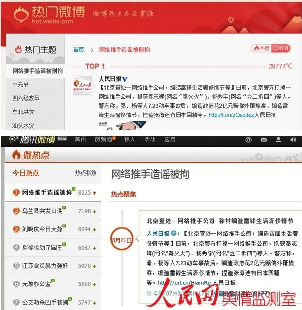 据人民网舆情监测室观察,新浪微博和腾讯微博上#网络推手造谣被拘#话题均成为今日微话题排行上的头号热门话题。今日此话题的相关微博已超过5万多条。