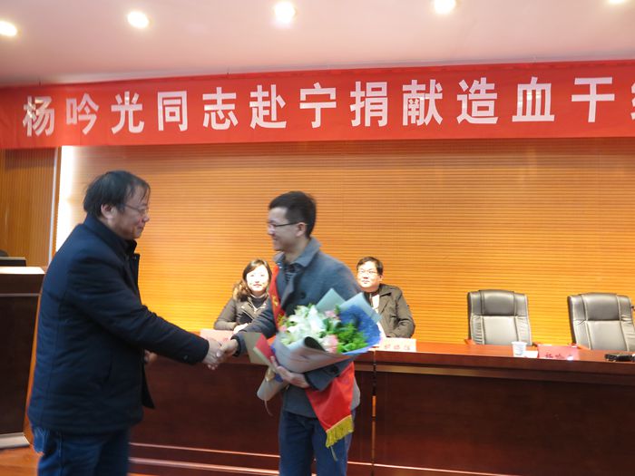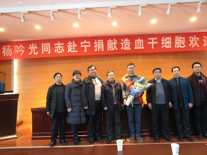 1月12日上午,镇江新区大港街道社区卫生服务中心的三楼会议室温暖如春,由新区文明办、社发局、镇江市第一人民医院新区分院联合在这里召开杨吟光赴南京捐献造血干细胞的欢送会。