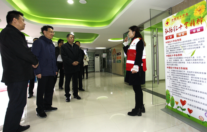 何权一行首先来到江北新区顶山街道大新社区“博爱家园”,详细了解了博爱家园的建设情况。大新社区始终坚持以“人道、博爱、奉献”精神为指引,创新启动“3+X”红十字工作模式,不断完善红十字基层组织和志愿服务队伍,开展红十字特色的防灾减灾、自救互救、逃生避险、卫生健康等服务。何权一行实地查看了红十字志愿岗、博爱超市、应急救护培训室、红十字文化角及多个特色功能活动室。他指出“红十字工作就是要面向群众,服务群众,才会有生命力”。