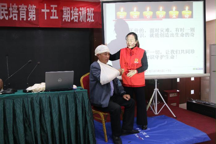 培训中,县红十字会资深讲师陈萍根据农民生产生活特性,重点对心肺复苏、创伤救护(止血、包扎、固定、搬运)的相关救护知识进行了讲解,采取理论知识和实践操作相结合的方式,生动直观,易于掌握。