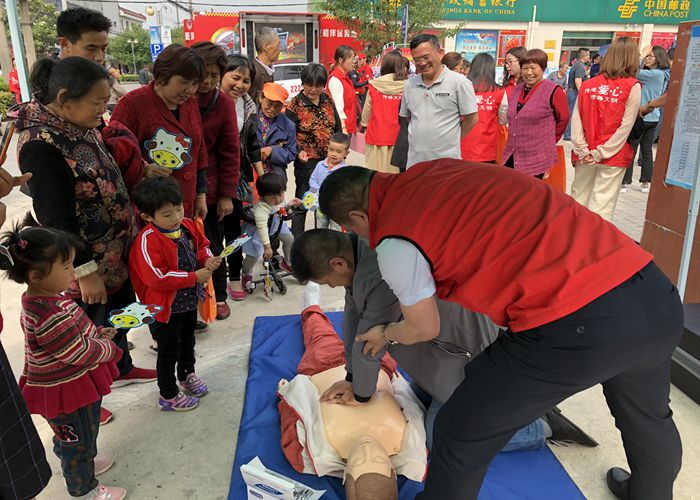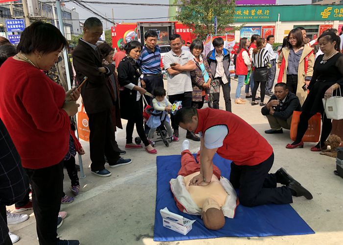 5月11日当天,丹阳市红十字会联合相关单位工作人员志愿者一行20余人来到司徒镇,在镇影剧院广场门口摆放了防灾减灾宣传板块,展示各种消防救护器材等,向过往的群众发放防灾减灾相关宣传资料。当天志愿者们顶着烈日,不停地接受群众咨询,红会的救护师现场为群众讲授心肺复苏知识和操作技能演练,累得满头大汗。一位认真听讲的阿姨笑呵呵地说:“平时我们老百姓一点都不懂急救知识,今天学到了很多,可以在我们遇到突发的事情的时候派上用场了,很实用,真的很好!”