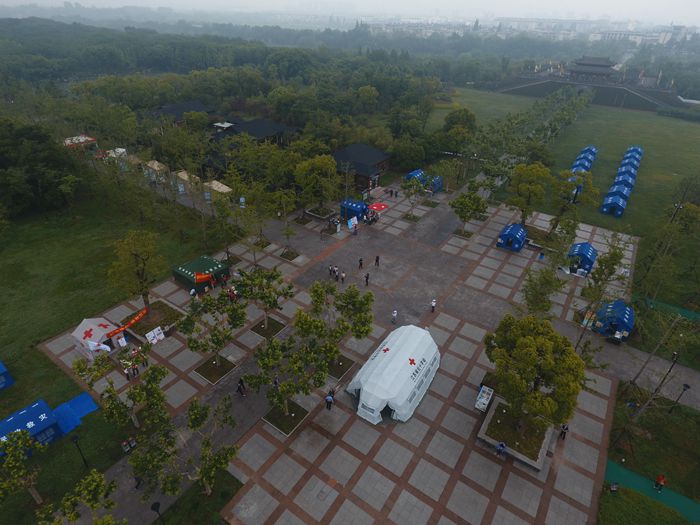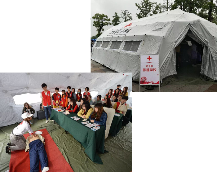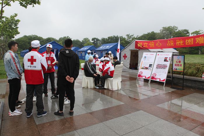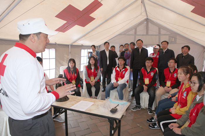 5月12日上午,副省长缪瑞林宣布活动正式启动后,按照应急预案要求及演练分工,红十字应急救援队承担了社会捐赠物资接收、志愿者招募及培训、心理援助与干预及设立帐篷学校、