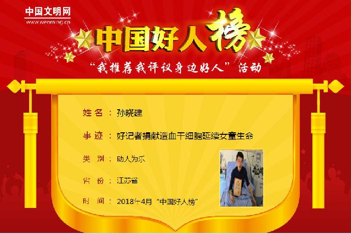 4月28日上午,在天津市和平区举行的2018年4月份中国好人榜发布仪式传来喜讯:连云港市灌云县“好记者”孙晓建(捐献造血干细胞延续女童生命)荣登助人为乐“中国好人榜”。