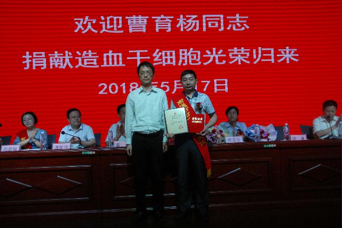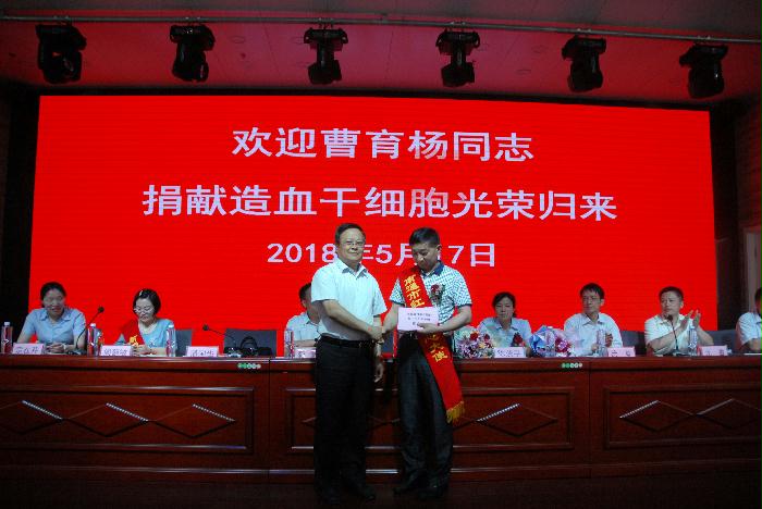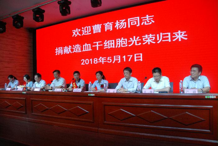 欢迎会上,市卫计委、市红十字会联合发起了在全市卫计系统开展向曹育杨同志学习的爱心行动。并联合向卫计系统发起招募无偿献血和造血干细胞志愿者的倡议。市中心血站陈明华副书记作为捐献者单位领导作了发言,同时积极响应倡议,代表血站党政工团向血站全体职工发出:“向曹育杨学习,为他人着想,捐献热血,分享生命,-----开展无偿献血和招募造血干细胞采样入库志愿者的倡议”。