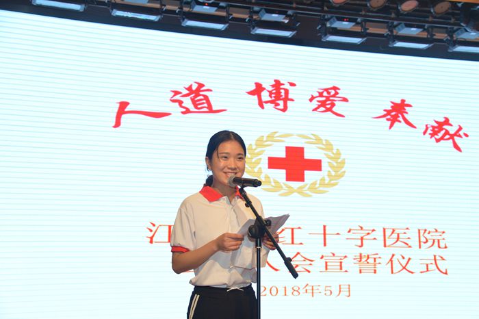 新会员代表孙红洁发言表示,作为一名红十字会会员,今后将努力践行红十字会七项基本原则,践行誓言,积极传播应急救护知识和技能。她说:“红十字会会员对我而言,已不仅仅是一个身份,更不仅仅是一份荣誉,而是一种激励,一种指引,引领我投入到医疗救护工作中去,用一生去践行‘人道、博爱、奉献’的红十字精神。”