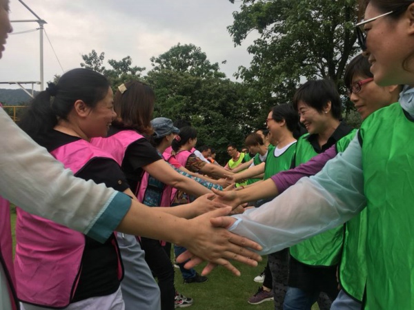 教练员将大家分成4个代表队,并推选出队长,各队在队长的带领下选出各具特色的队名、口号。力量绳圈建立队员间的信任和责任感,音速追击体现团队的合作精神,激情150考察团队解决问题的能力。