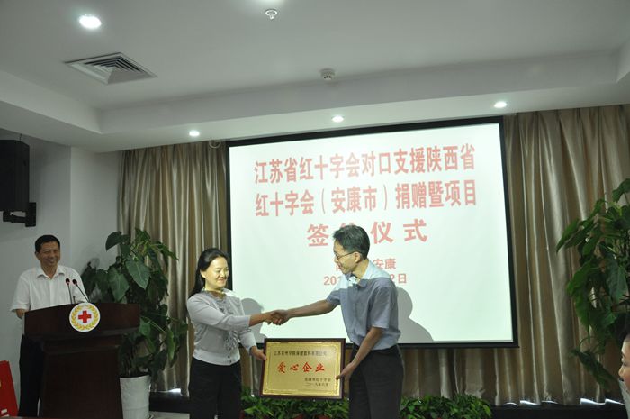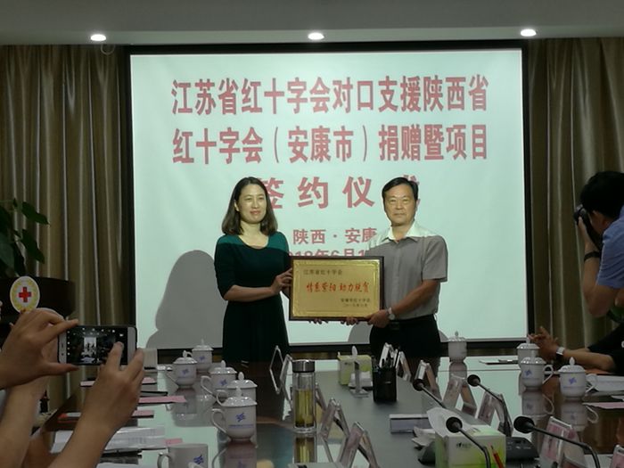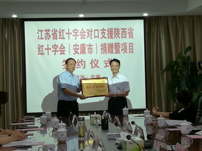 江苏省常州市红十字会党组书记、常务副会长钱斌代表常州华联保健敷料有限公司向安康市红十字会捐赠急救包1000个,安康市红十字会常务副会长鲁琍接受捐赠