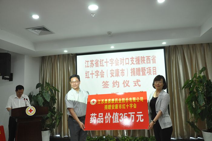 江苏奥赛康药业股份有限公司副总经理林毓向安康市红十字会捐赠药品价值35万元,安康市政府副秘书长谢奎接受捐赠