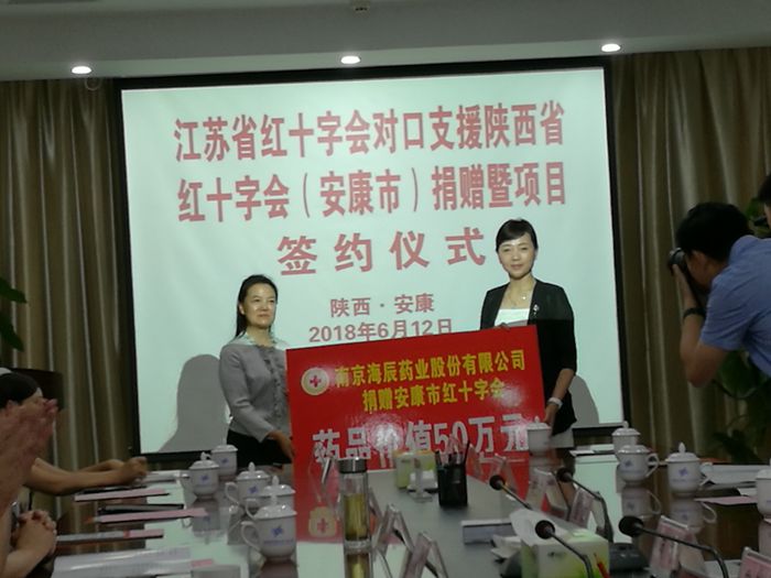 南京海辰药业股份有限公司工会主席李进向安康市红十字会捐赠药品价值50万元,安康市红十字会常务副会长鲁琍接受捐赠