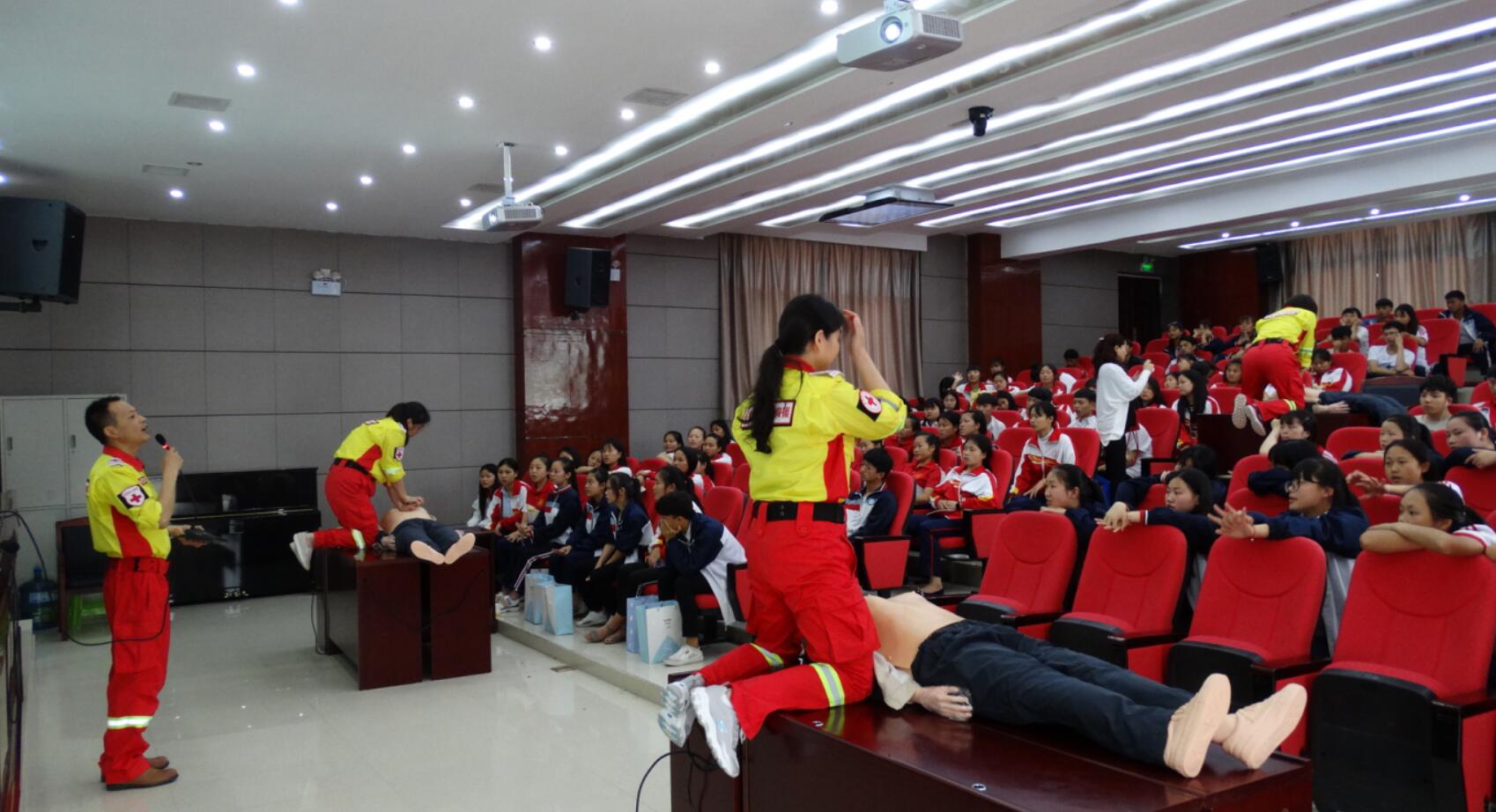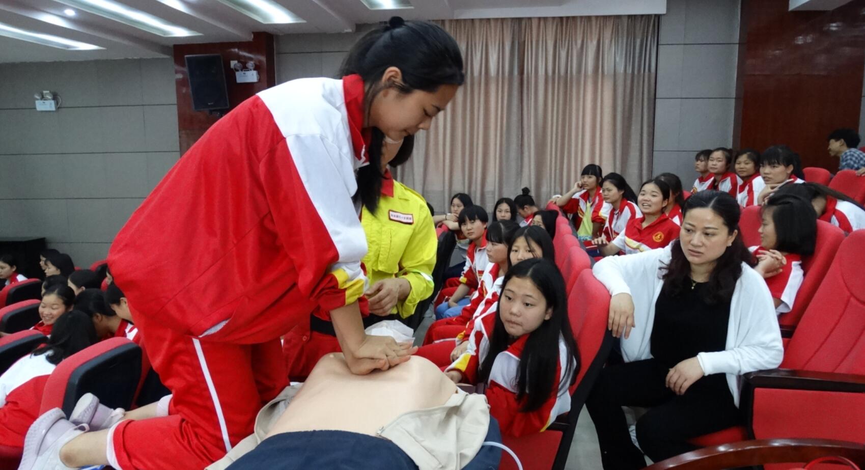 整场培训气氛热烈,互动有力,笑声不断。6位同学还上台进行了心肺复苏操作体验。在提问环节,应同学的要求,培训老师还讲解并示范了触电、气道异物梗阻、烫伤等自救互救知识。学生们积极参与,现场气氛十分活跃,整个培训达到了高潮。