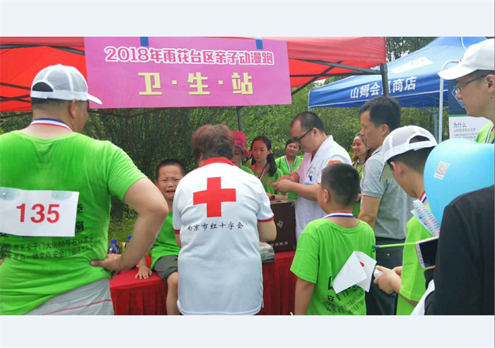 就在冲破终点的时候,有位小朋友不慎摔了一跤,跌破了手臂和膝盖,表情痛苦,哇哇大哭。就在此时红十字会救护员蒋陵业老师迅速冲了上去,一边安抚小朋友,一边进行伤口处理包扎。等救护完,小朋友露出了笑容,我们的救护员也得到了群众的点赞。
