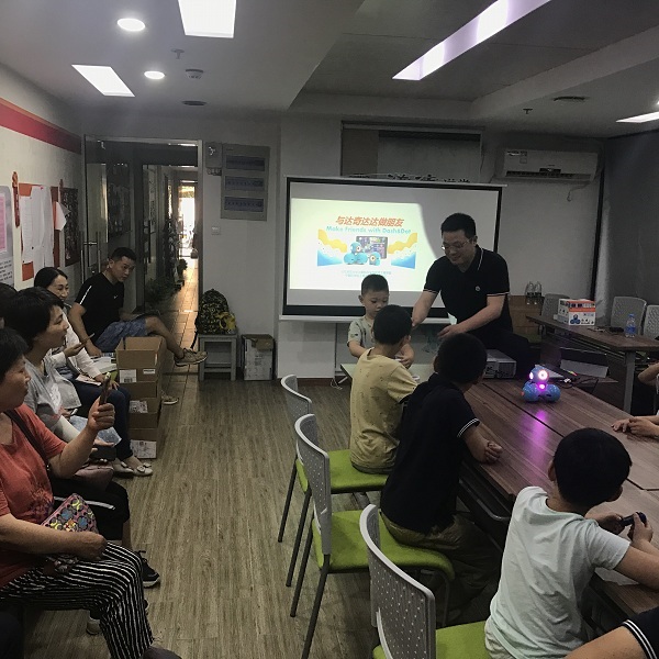 课前,老师考虑到孩子们年龄差异较大的问题,便将孩子两两分组,由年龄大的孩子带着年龄稍小的孩子一起完成今天对机器人“达达”的探索,同时,这也能帮助社区里的孩子更好的认识和交流。