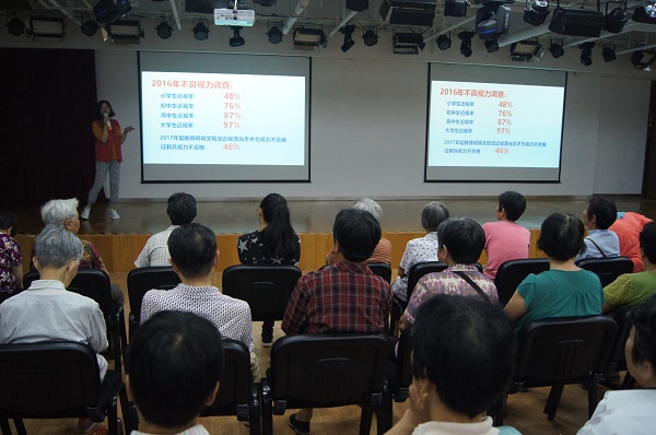 6月6日是全国爱眼日,大家都知道眼睛是认识世界的重要器官,也是人类沟通外界的渠道,心灵的窗口,加强大家爱眼、护眼的知识,为大家宣传用眼卫生和眼疾病防治措施是一件重要的事情,6月6日下午,常州市青龙街道红十字会特邀耀星青少年普法服务中心讲师,在青龙文体中心一楼演播厅为社区居民举办了一场爱眼护眼讲座,数据化地将近视率展现在居民眼前,通过视频讲解形象地普及了科学用眼知识,提高公众的健康正确的用眼水平,讲座后更有免费体验眼贴和发放眼贴的环节,预防眼疾,使心灵的窗口因此而更加明亮与纯净,希望更多的人关注眼睛的健康,将近视拒之千里之前!