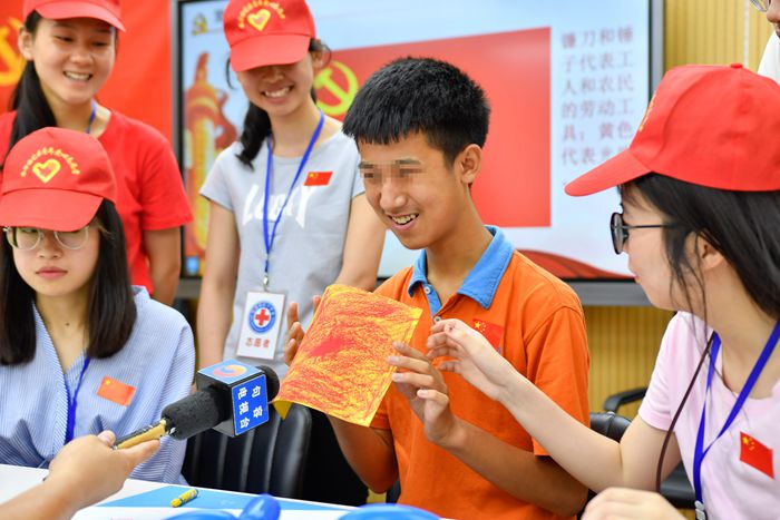 主题活动中,志愿者结合PPT向孩子们绘声绘色地讲解了一些简单的党的知识,耐心地引导孩子们在地图上重走长征路,同时以故事的形式让他们了解相关的历史事件与名人事迹,孩子们跟着志愿者的思路,认识了地图,了解了中国幅员之辽阔,地大之物博;接着在志愿者们的细心帮助下,孩子们画出星星、镰刀、锤子的图案,并剪切粘贴在红色背景纸上制作成党旗国旗;志愿者还准备了《义勇军进行曲》MV,教孩子们合唱国歌。通过一系列环节,让孩子们树立爱国信念,深化爱国之情。活动最后,孩子们挥舞着国旗,和志愿者们一起艰难却又坚定地齐声祝愿:中国共产党生日快乐!