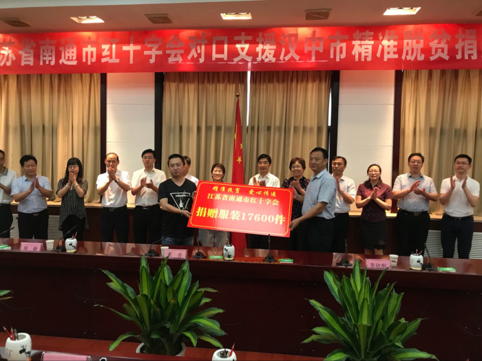 6月28日上午,“江苏省南通市红十字会对口支援汉中精准脱贫捐赠仪式”在汉中市政府大成殿会议室举行。会上,南通市红十字会向汉中市红十字会捐资夏装17600件。汉中市市委常委、副市长程腮仙,南通市政府党组成员、市红十字会会长朱晋,南通市市委副秘书长、市红十字会副会长李欣彤,南通市政府副秘书长、市红十字会副会长周健,南通市红十字会党组成员、会长助理朱建新,汉中市政府副秘书长江华、汉中市红十字会常务副会长兼秘书长金清杰等领导参加了捐赠仪式。